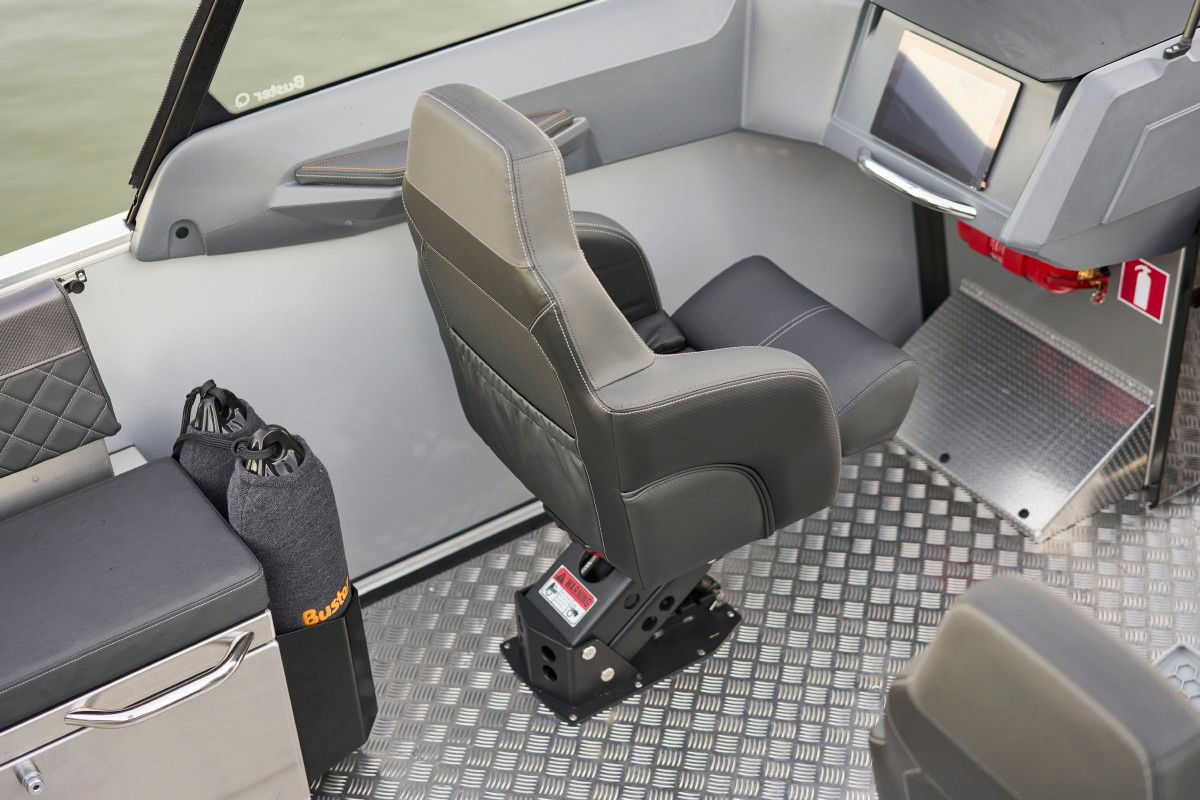 Förarpulpetens mittpunkt är den stora uppdaterade 16" Buster Q 2.0 Smart Display, ett omfattande infotainmentsystem som innehåller Navionics elektroniska sjökort, radio, aktuell väderinformation och båtens instrument. En praktisk funktion är att skärmen kan delas, vilket gör det möjligt att visa kartor i två olika skalor samtidigt. Detta gör att föraren kan ta ut kursen på en karta och zooma in detaljer på den andra. Buster SuperMagnum kan också utrustas med en extra 10" Buster Q Smart Display för passagerarkonsolen, så passagerare kan hjälpa till att navigera och styra musiken utan att föraren behöver bli distraherad. All båtdata och loggboken kan synkroniseras till en mobil enhet via Buster-appen, utan att vara i närheten av båten.