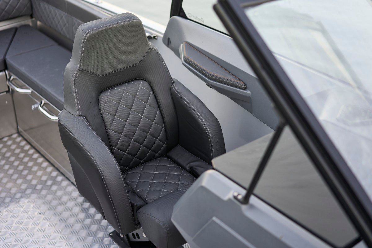Standardutrustningen inkluderar en tiltratt och trimplan med joystickstyrning, lanternor och nyckellös tändning. Durken på är tillverkad av halkfri, mönstrad aluminium, medan räckena och andra däcksbeslag är tillverkade av rostfritt stål. Den U-formade aktersoffan är också standard.