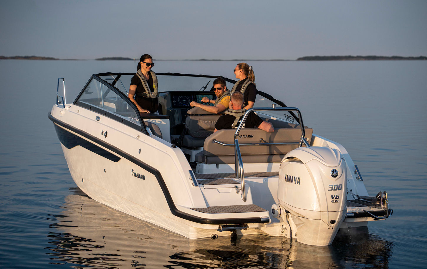 Standardutrustningen inkluderar en elektrisk toalett, kylskåp, en 16” Yamarin Q Smart Display, Navionics elektroniska sjökort och Softdeck i sittbrunnen. Extrautrustning inkluderar en andra 16” Smart Display, värmare eller luftkonditionering, en bimini eller kapell, ett bord till sittbrunnen, en solbädd till fördäcket.