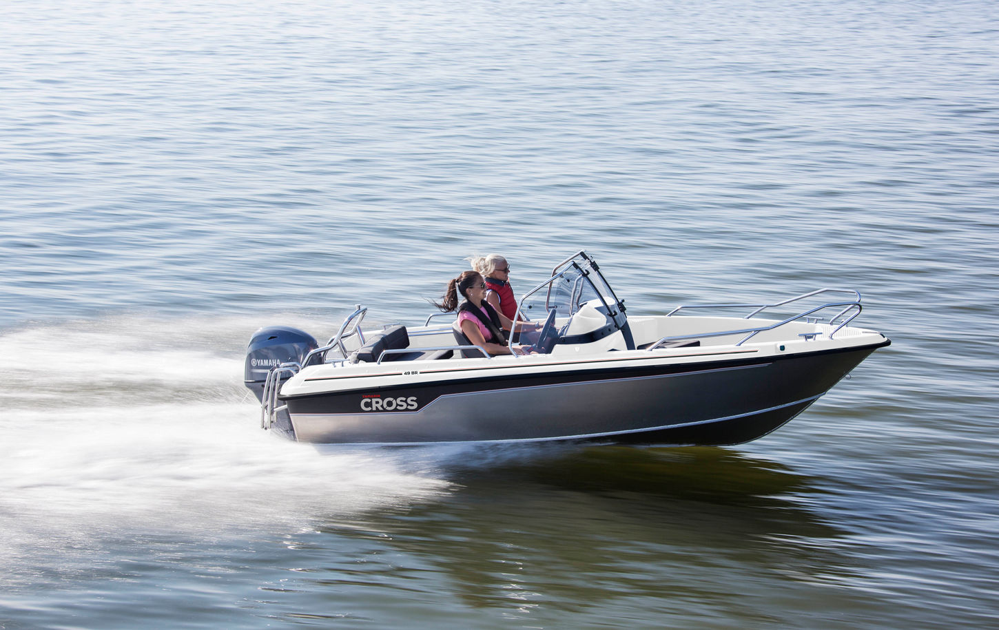 Cross 49 BR är en perfekt båt att ha vid sommarstället eller närmaste småbåtsbrygga eftersom är kompakt och smidig, därmed alltså idealisk för sköna spontana dagsutflykter. De separata sätena erbjuder komfort samtidigt som de bidrar med en känslan av en större båt. I Cross 49 BR färdas fem personer bekvämt, och tack vare de mångsidiga förvaringsmöjligheterna, finns det gott om plats för både campingutrustning och matsäck. Vi har heller inte kompromissat vad gäller båtens stil eller hållbarhet. Det kraftiga aluminiumskrovet och det bekväma glasfiberdäcket skapar en både hållbar och elegant design.