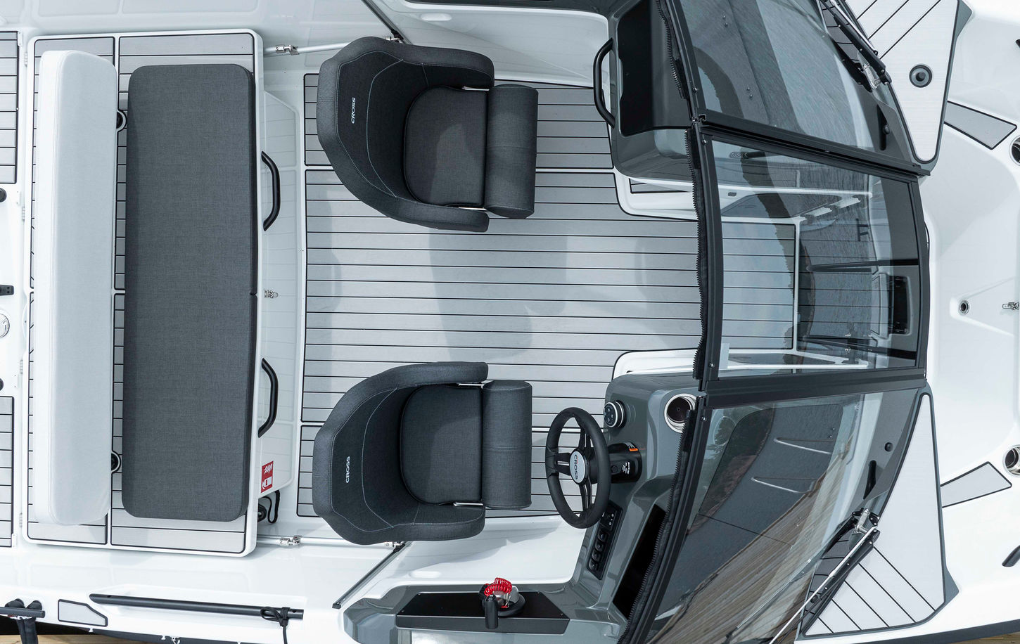 Båtens bakre del är öppen och lättillgänglig. Ryggstödet kan enkelt tas bort när akterplattformen används för fiske eller solbad. De breda badplattformarna sträcker sig långt bak på båda sidor om motorn, vilket underlättar ombordstigning. Den stora bakre plattformen erbjuder också möjlighet att sitta bekvämt i hamnen eller på stranden, vänd bakåt med fötterna på badplattformen. En valfri vattenskidbåge underlättar också rörelse på den bakre däck.
